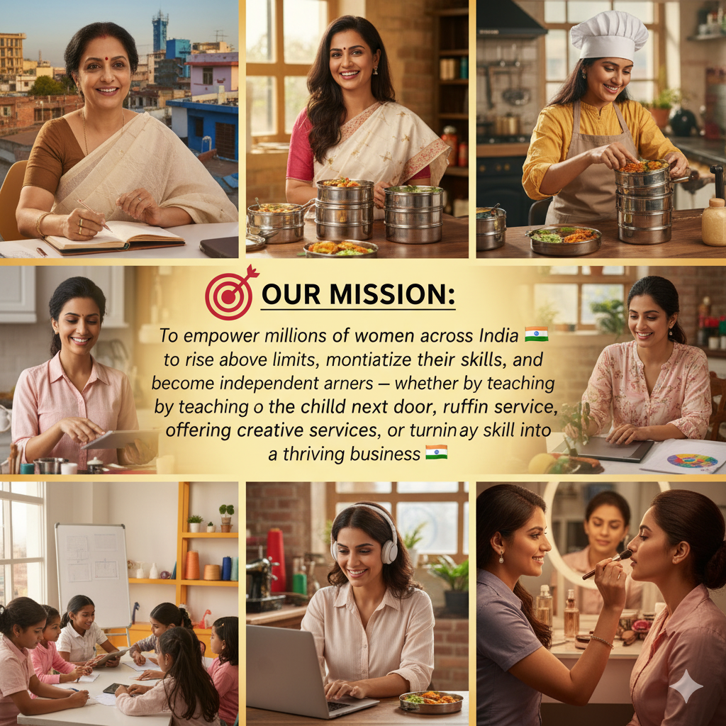 To empower millions of women across India ๐ฎ๐ณ to rise above limits, monetize their skills, and become independent earners โ whether by teaching the child next door, running a tiffin service, offering creative services, or turning any skill into a thriving business.